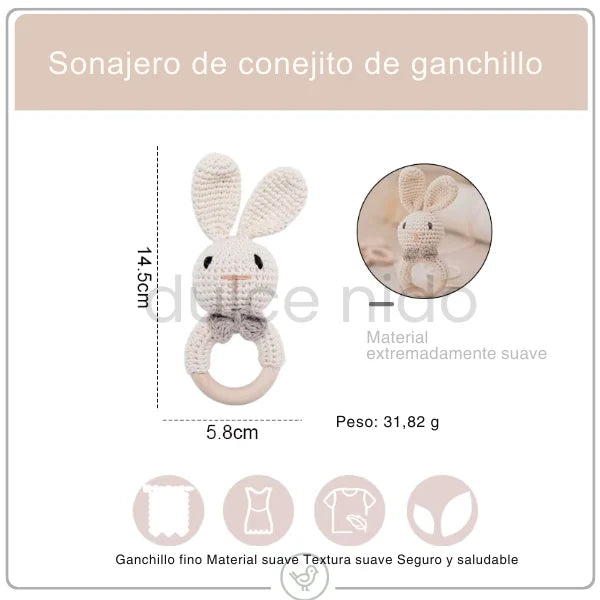 El sonajero de conejito tejido en croché con aro de madera de Dulce Nido está pensado para ser uno de sus primeros compañeros de brazos: tierno, ligero y fácil de sujetar por manos pequeñitas.