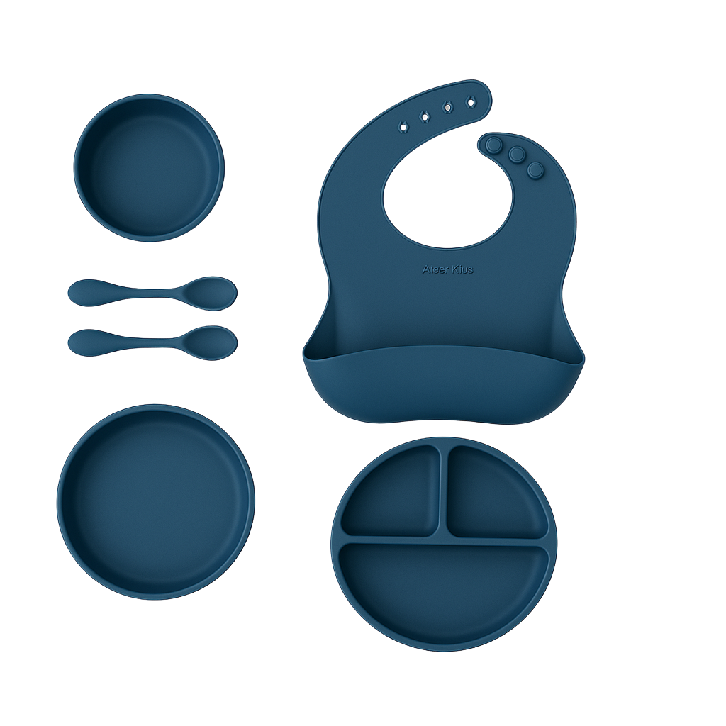 🌟 Set completo de 6 piezas: plato con divisiones, bowl, vaso con asas, babero con bolsillo recolector y cubiertos con puntas suaves.